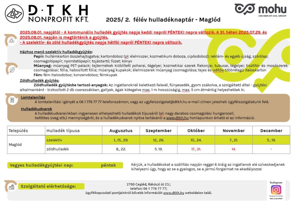 Emlékeztetőül: Maglódon mind a kommunális, mind a szelektív- és a zöldhulladék szállítás is péntekenként történik. A kommunális szállítás heti sűrűségű, míg a szelektív szállítás kéthetenkénti, azaz idén még hatszor lesz: október 10-én, 24-én, november 7-én, 21-én, december 5-én és 19-én. A zöldhulladékot ebben az évben még háromszor viszik el (szintén kéthetes időközökkel): október 17-én, 31-én és november 14-én.