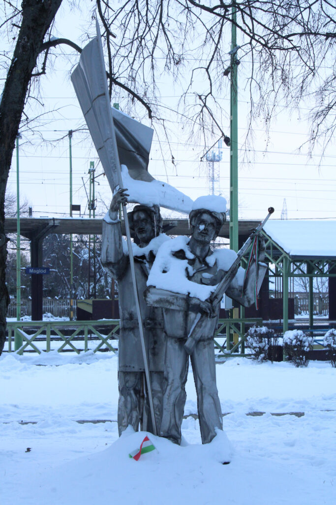 Szürkés latyak az országút mentén és csillogóan fehér hó a pusztán. Hókupacok a járdák szélén és némán hallgató fák csoportja a patak partján. Az állomás mellett az ’56-os fiúk már régóta fagyoskodnak a hidegben, miközben a peron mellett elhaladó gyorsvonat hófuvallatot húz maga után. Régen ez hónapokig így ment, most pár napnyi igazi tél jutott. A múlt hét óta Maglódot is hótakaró borítja.