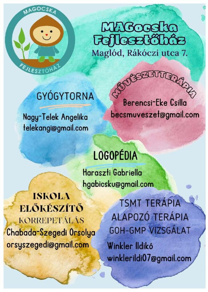 A tavaly október 1-jén a Rákóczi u. 7. sz. alatt megnyílt MAGocska fejlesztőház kínálata tovább színesedett. Berencsi-Eke Csilla (művészetterápia); Chabada-Szegedi Orsolya (iskolaelőkészítő); Nagy-Telek Angelika (gyógytorna); Winkler Ildikó (tervezett szenzomotoros tréning, alapozó terápia, beszédhallást, -észlelést, -megértést vizsgáló eljárás) és Haraszti Gabriella (logopédia) mellé Széphelyi Dóra pszichológus társult.