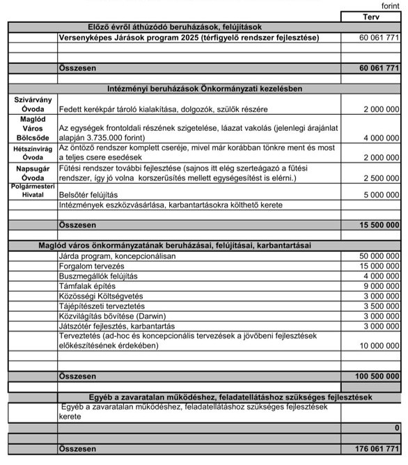 Jelentős eredmény, hogy a 2026-ra tervezett beruházási keret az előző évi duplája. A célunk az, hogy a megítélt többlettámogatásokat majd szintén beruházási célokra fordítsuk. 100 M Ft-ot tervezünk városfejlesztésre, ezen belül a legnagyobb tétel a járdaépítés. De forgalomtervezésre, buszmegálló-felújításra, támfalépítésre, tájépítészeti- és egyéb terveztetésre, közösségi költségvetésre, közvilágítás- és játszótérfejlesztésre is gondolunk. 15 M Ft az intézményi célfelújítás kerete (fedett kerékpártároló, lábazatszigetelés, kertfelújítás, fűtési rendszer korszerűsítés, belső felújítások). Összesen 60 M Ft-ot terveztünk intézményi felújításra, karbantartásra és eszközbeszerzésre.