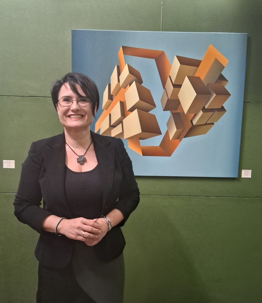 – Kocka volt az egyik becenevem kiskoromban a széles állvonalam miatt. Ez a sorozat egy önismereti folyamatot jelenít meg. A kocka a racionalitás, a hámozás pedig a fájdalmas és izgalmas megismerési folyamat. Igen hosszú folyamat az eddigi életutam folyamán rám rakódott rétegeket visszafejteni, és megtalálni, ki is vagyok én most. A kocka nem pusztán formai elem, hanem az Én kifejeződése. Célom, hogy a nézőt kimozdítsam a megszokott valóságából, és lehetőséget adjak egyfajta belső reflexióra, ahol a geometrikus rendszerek az állandóság és a nyugalom érzetét közvetítik. Műveimmel nem kész válaszokat akarok adni, hanem kaput nyitni. A festészetem vallomás a sorsomról, a küzdelmeimről, és arról a végtelen rendről, amelyet a világban keresek. A geometriai formák szigora számomra a biztonságot és a kiszámíthatóságot nyújtja.