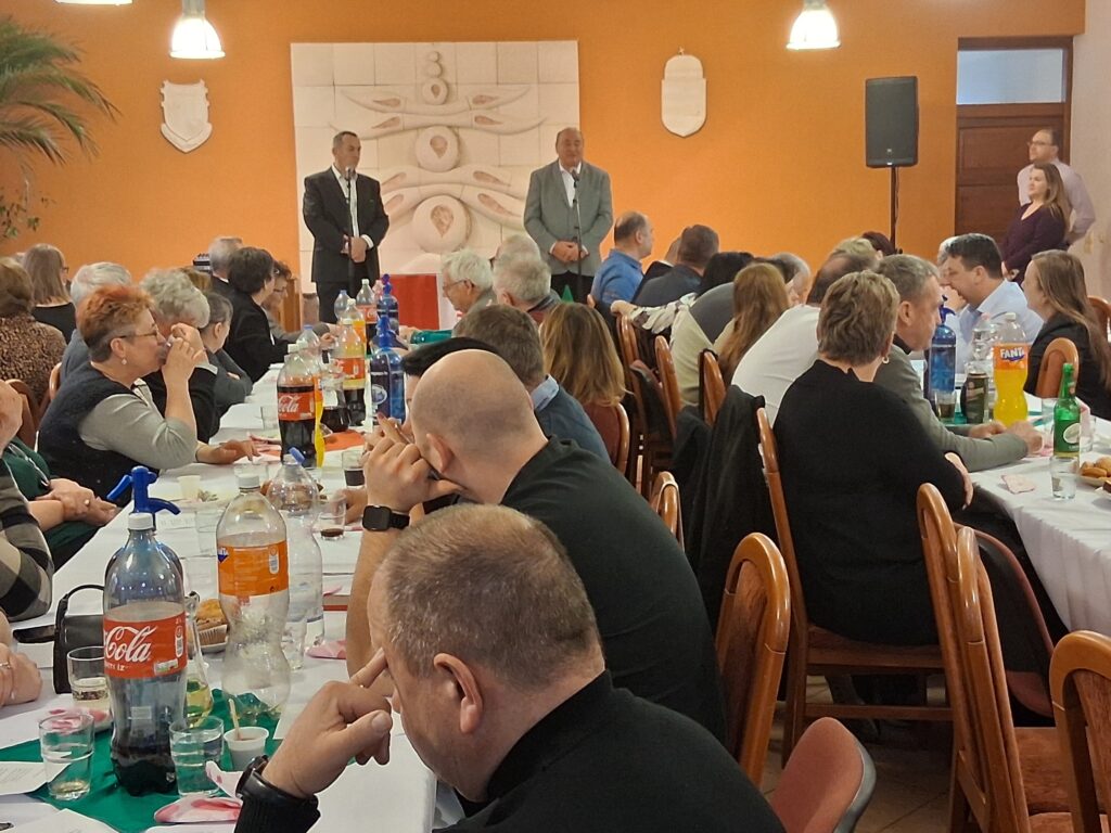 és Falusi-Tóthné Koller Ilona (a „méhkirálynő”, a kép bal szélén középen, végre leülhetett), jobb szélen Herendi Tamás alpolgármester és Kalmár Csilla Imola, a találkozó háziasszonya.